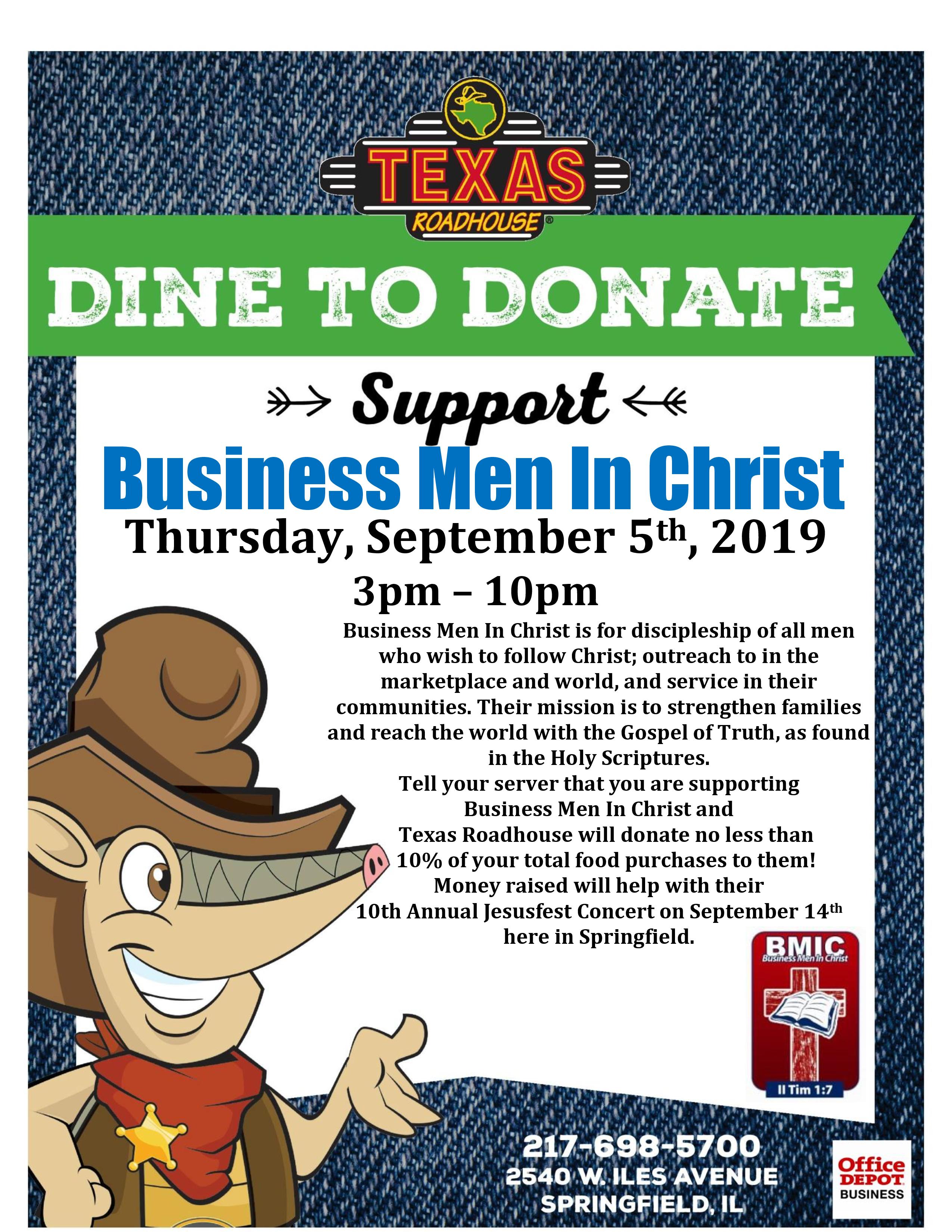Please inform your server (waiter or waitress) at Texas Roadhouse, that you are there to support Business Men in Christ, in so many words. The restaurant will then donate 10% of diner’s ticket to our organization – BMIC. Thank you